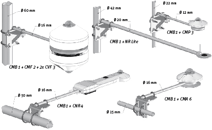 L’accessorio CMB1 è un supporto universale sul quale possono essere montate tutte le aste di montaggio, dal diametro 12 mm al diametro 20 mm; il radiometro così installato può essere livellato rotando ed inclinando l’asta. Il supporto include bulloni a U per il fissaggio su pali da 22 mm a 60 mm di diametro; nel caso in cui vengano rimossi i bulloni a U, il supporto è utilizzabile per il fissaggio a parete.