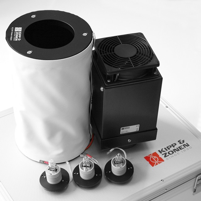 Un attrezzo distanziale dotato di tendina garantisce che la lampada di calibrazione sia posta alla distanza corretta dall’ottica del Brewer; un alimentatore da tavolo con tastiera e schermo fornisce un voltaggio DC molto stabile alla lampada, permettendo la programmazione dei tempi di rampa e raffreddamento.