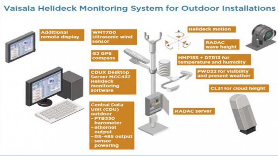 Il sistema Vaisala Helideck Monitoring System (HMS) fornisce informazioni precise circa le condizioni meteo prevalenti e l’oscillazione della piattaforma per elicotteri per aiutare in una corretta e sicura pianificazione delle attività di volo e atterraggio in installazioni offshore.